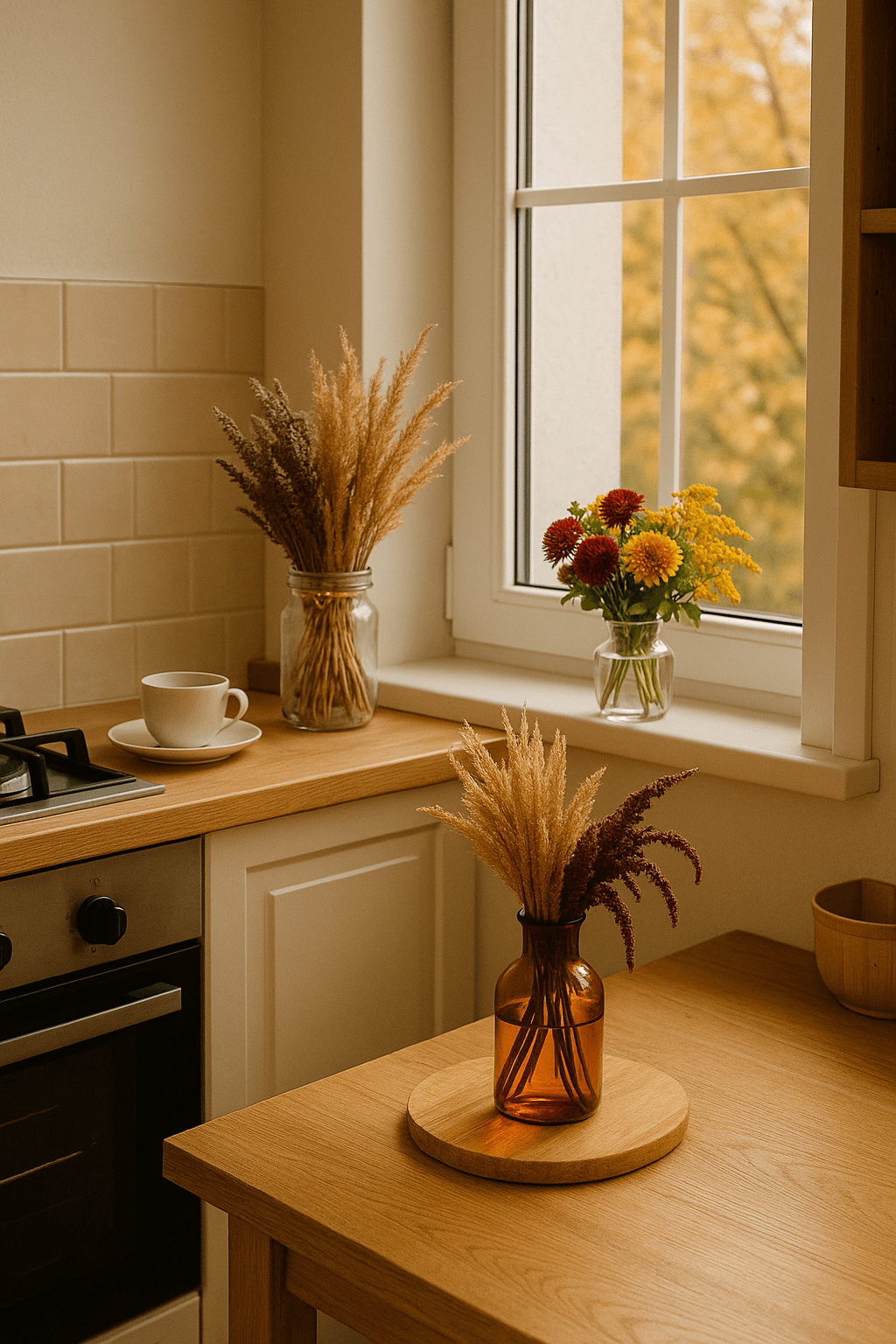 Кухня — это не только место для приготовления пищи, но и пространство, где каждый элемент интерьера должен быть практичным и гармоничным. На кухне отлично будут смотреться сухоцветы и маленькие букеты.