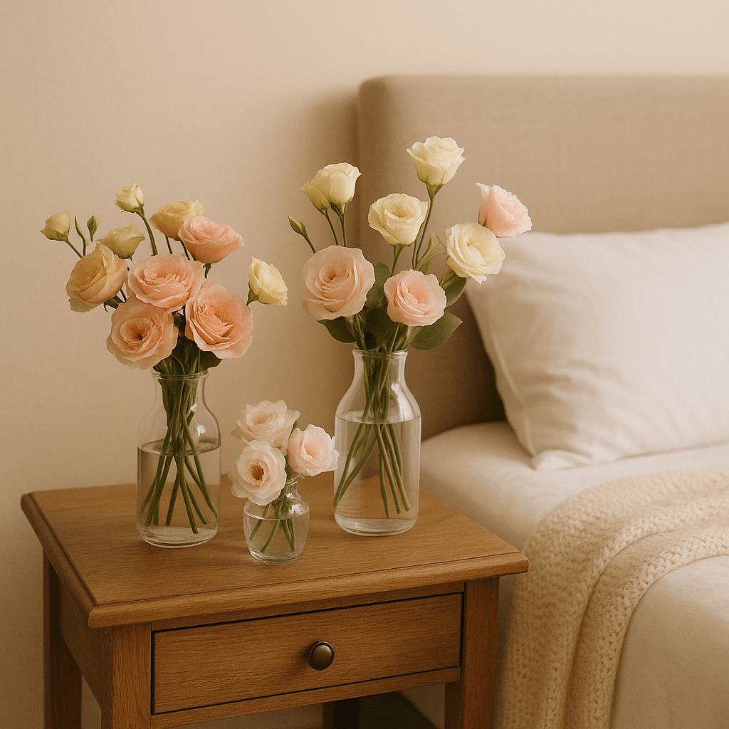Спальня — это место для отдыха и расслабления, поэтому композиции для этой зоны должны быть нежными и успокаивающими. Здесь отлично подойдут нежные розы и эустома.
