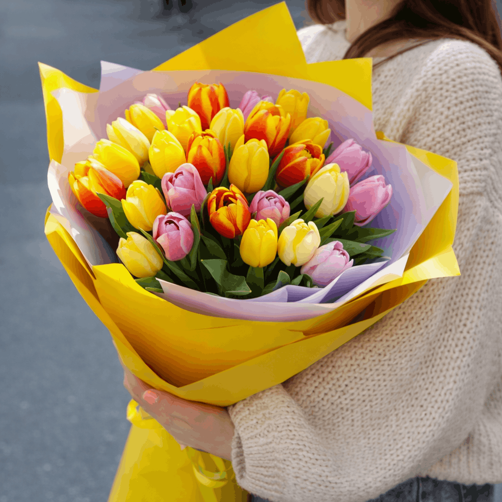Отдельную популярность имеют букеты из разноцветных тюльпанов. Например, композиции из 35 цветов создают яркий и динамичный визуальный эффект.