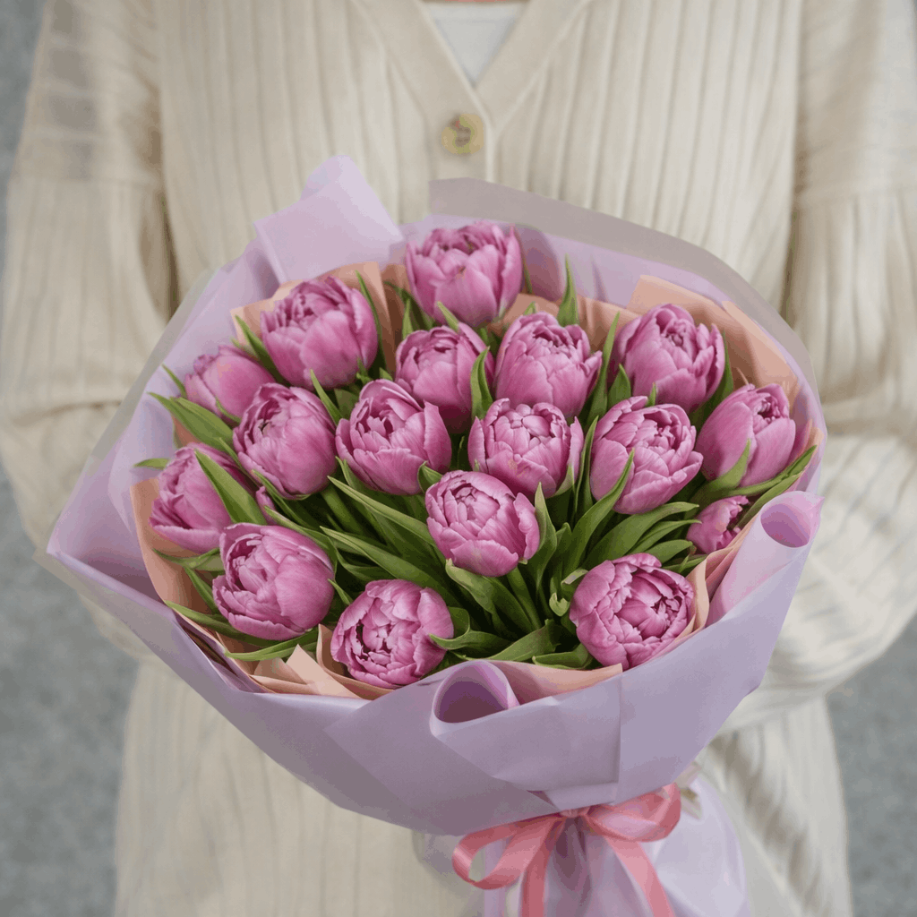 Монобукеты из тюльпанов — один из самых популярных вариантов весенних композиций. На сайте можно встретить разные форматы таких букетов — от небольших до крупных композиций на 35 или 51 цветок.