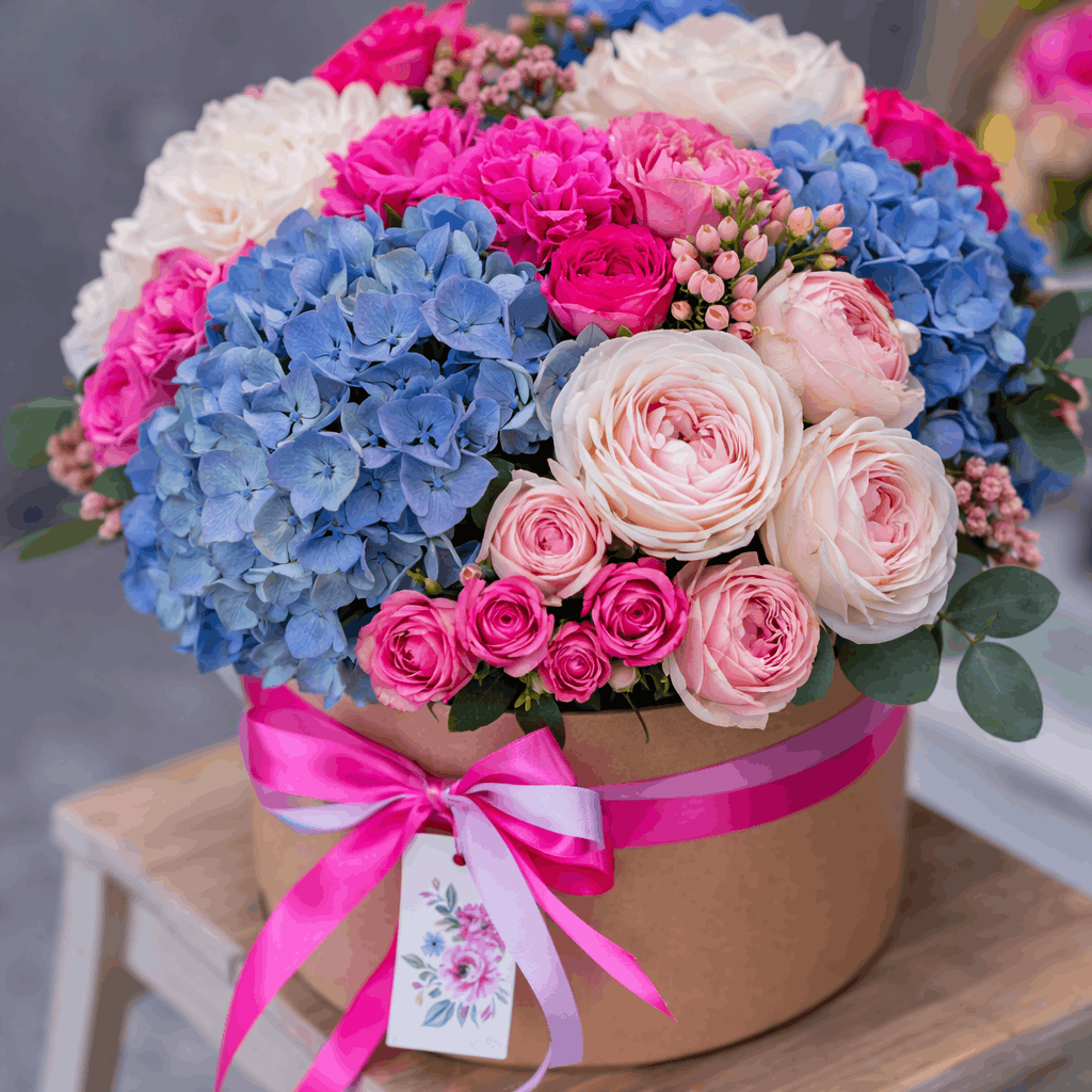 Еще один популярный формат — цветы в коробке. Такие композиции выглядят аккуратно и не требуют вазы, поэтому часто используются как готовый подарок.